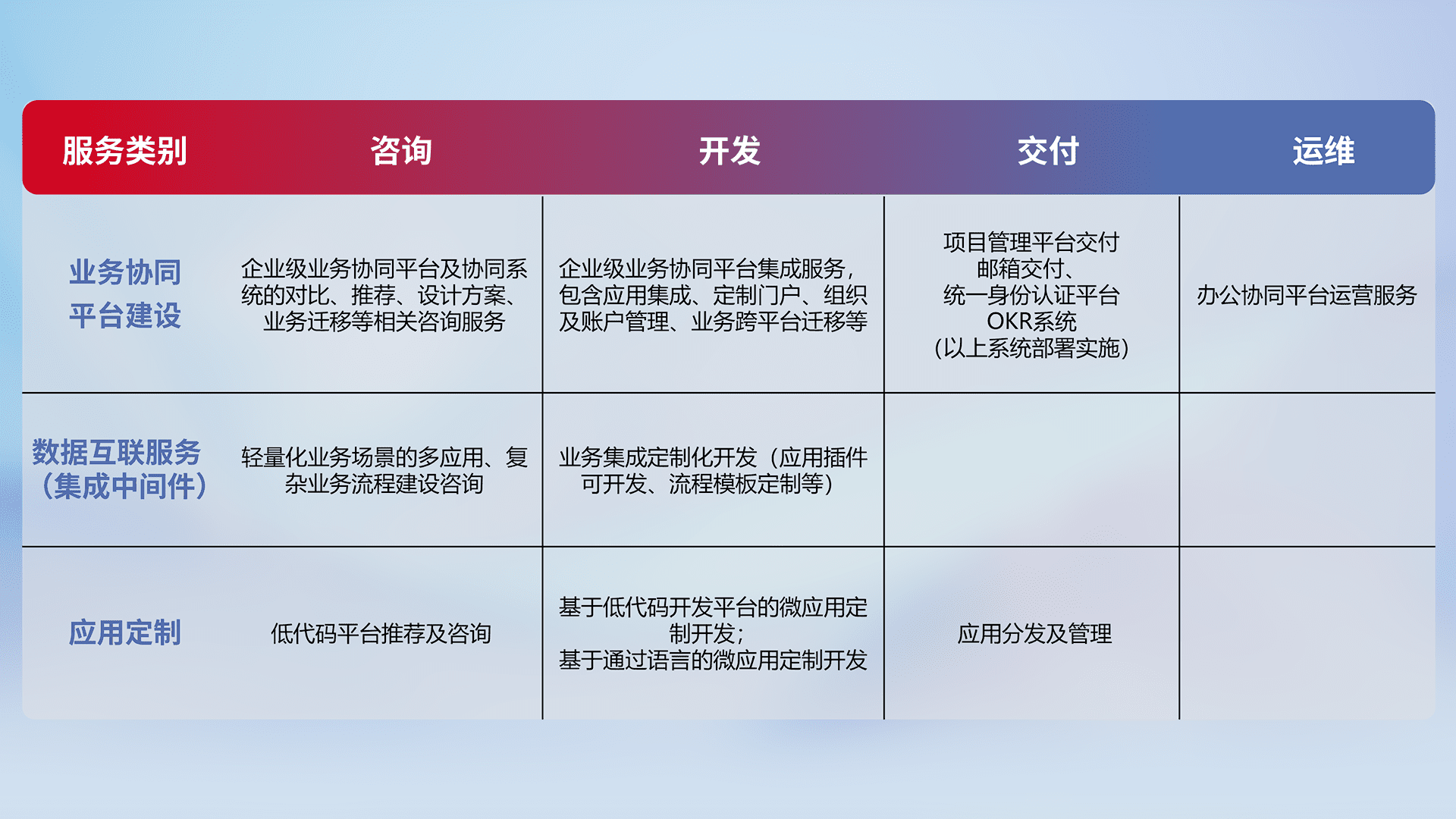 针对钉钉、、、、企微、、、IDaas等平台级产品提供产品的规划、、、方案、、、、交付、、、、定制化开发等服务,,实现如统一协同办公、、智能客户服务、、混合会议管理、、、、智能数据查询、、等业务场景,,,,实现数字化转型。。